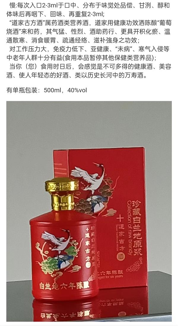 6瓶1箱 白兰地道家古方酒 药酒营养酒 温通散寒 滋补强身
