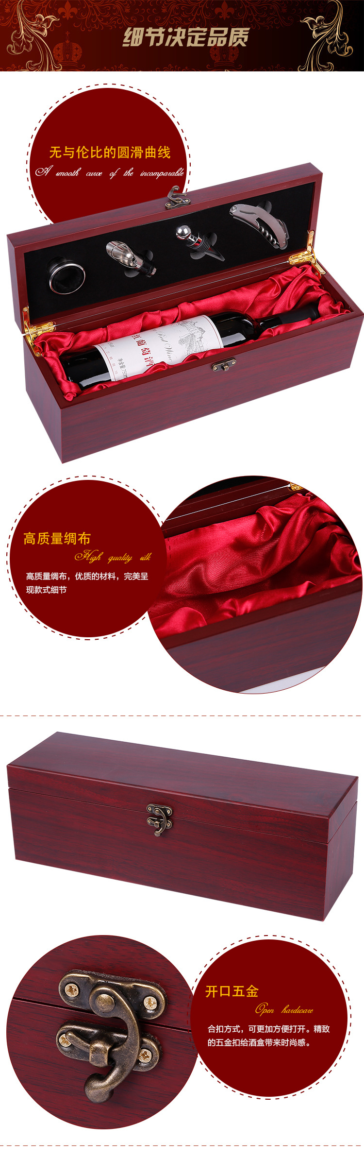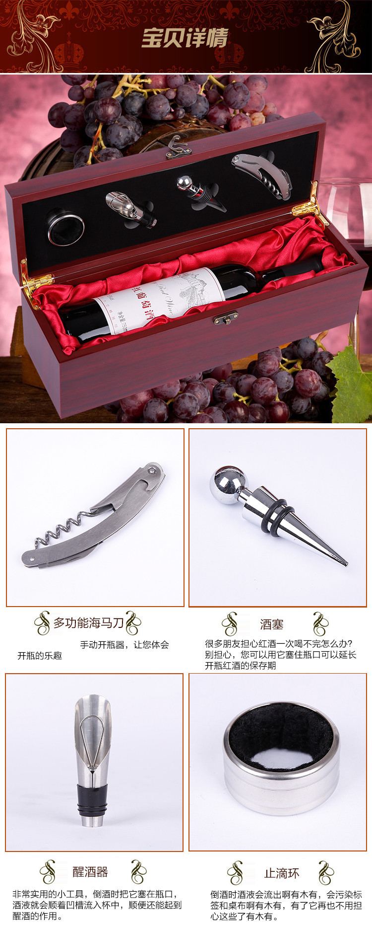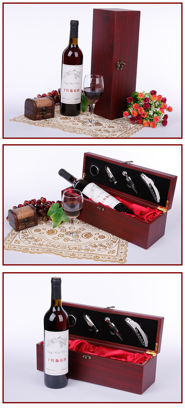 高档红酒盒单支木盒子葡萄酒盒礼盒拉菲盒酒具套装四件套