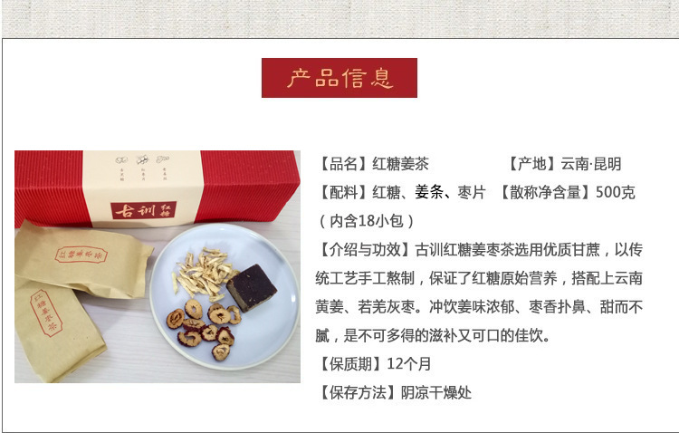 云南古训红糖 黑糖姜枣茶 红糖姜茶礼盒装18小袋共500克